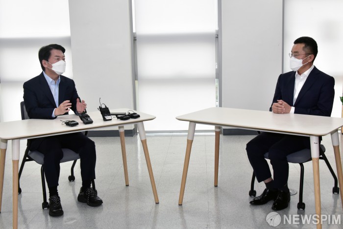[안양=뉴스핌] 국회사진취재단 = 안철수 국민의당 대표가 4일 경기 안양시 자율주행 벤처기업 (주)에스더블유엠을 방문해 김기혁 대표와 대담하고 있다. 2021.11.04 photo@newspim.com