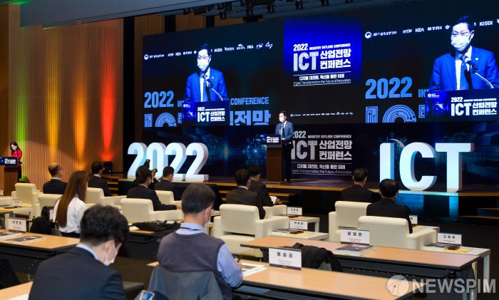 [서울=뉴스핌] 조경식 과학기술정보통신부 제2차관이 4일 오후 오전 서울 중구 대한상공회의소에서 열린 '2022 ICT 산업전망 컨퍼런스 개회식'에서 환영사를 하고 있다.[사진=과학기술정보통신부] 2021.11.04 photo@newspim.com