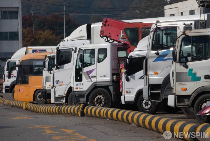 [서울=뉴스핌] 윤창빈 기자 = 중국발 요소수 품귀 현상이 심해지고 있는 5일 서울 양천구 서부트럭터미널에 화물차들이 멈춰서있다. 정부는 매점매석 단속을 강화하고 대체 물량 확보를 위한 외교적 노력을 하는 한편 산업용 요소를 차량용으로 전환하는 방안도 검토 중이다. 2021.11.05 pangbin@newspim.com