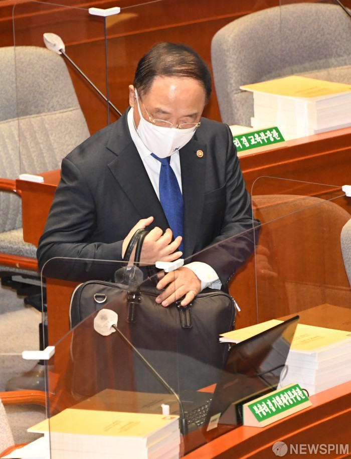 [서울=뉴스핌] 이형석 기자 = 홍남기 경제부총리가 5일 국회에서 열린 예산결산특별위원회에서 20222년도 예산안에 대한 답변자료가 든 가방을 들고 입장하고 있다. 2021.11.05 leehs@newspim.com
