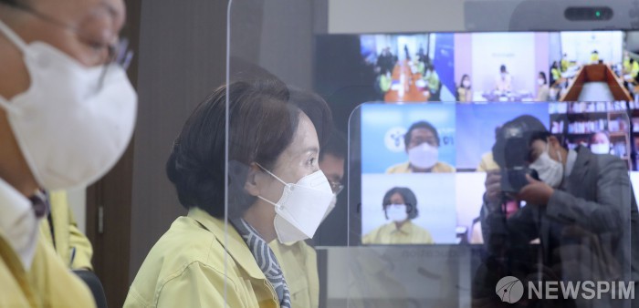 [서울=뉴스핌] 김학선 기자 = 유은혜 사회부총리 겸 교육부 장관이 10일 서울 종로구 정부서울청사에서 열린 '안전한 수능, 수도권 전면등교 준비를 위한 방역점검회의'를 주재하며 모두발언을 있다. 2021.11.10 yooksa@newspim.com