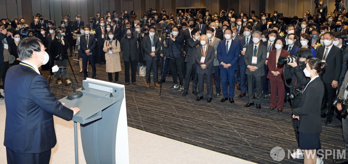 [서울=뉴스핌] 국회사진취재단 = 윤석열 국민의힘 대선후보가 10일 그랜드워커힐서울에서 열린 글로벌인재포럼 2021에서 인사말을 하고 있다. 2021.11.10 photo@newspim.com