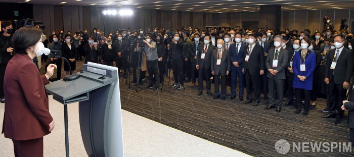[서울=뉴스핌] 국회사진취재단 = 심상정 정의당 대선후보가 10일 그랜드워커힐서울에서 열린 글로벌인재포럼 2021에서 인사말을 하고 있다. 2021.11.10 photo@newspim.com