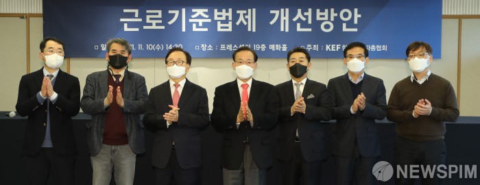 [서울=뉴스핌] 김민지 인턴기자 = 이동근 한국경영자총협회 부회장(왼쪽 세번째)이 10일 오후 서울 중구 한국프레스센터에서 열린 근로기준법제 개선방안 토론회에서 참석자들과 기념촬영을 하고 있다. 2021.11.10 kimkim@newspim.com