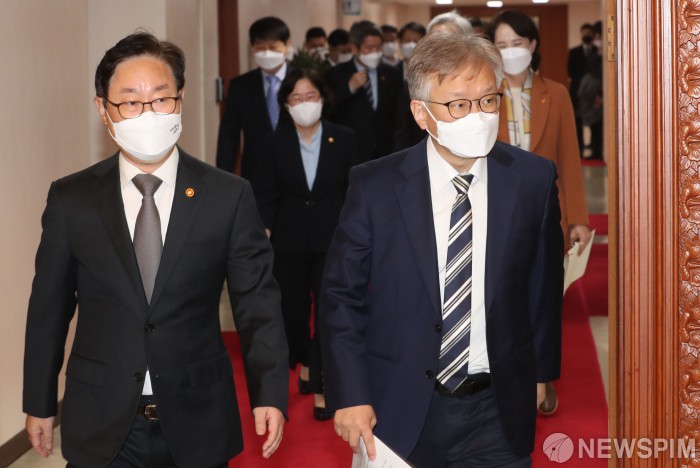 [서울=뉴스핌] 김학선 기자 = 박범계 법무부 장관과 권칠승 중소벤처기업부 장관이 11일 서울 종로구 정부서울청사에서 '요소수 긴급수급조치 시행'과 관련해 열린 임시 국무회의에 참석하고 있다. 2021.11.11 yooksa@newspim.com