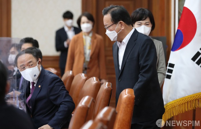 [서울=뉴스핌] 김학선 기자 = 김부겸 국무총리가 11일 서울 종로구 정부서울청사에서 '요소수 긴급수급조치 시행'과 관련해 열린 임시국무회의에 참석하며 홍남기 부총리와 인사하고 있다. 2021.11.11 yooksa@newspim.com