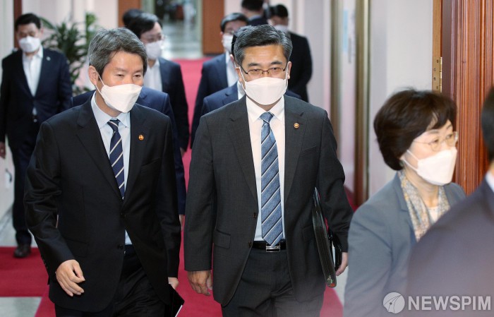 [서울=뉴스핌] 김학선 기자 = 서욱 국방부 장관과 이인영 통일부 장관이 11일 서울 종로구 정부서울청사에서 '요소수 긴급수급조치 시행'과 관련해 열린 임시 국무회의에 참석하고 있다. 2021.11.11 yooksa@newspim.com