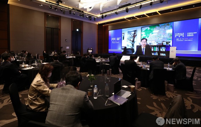 [서울=뉴스핌] 정일구 기자 = 11일 오전 서울 여의도 콘래드 서울에서 김영진 더불어민주당 의원·유경준 국민의힘 의원·뉴스핌·한국블록체인협회 주최로 열린 '디지털자산의 합리적 과세방안 토론회'에서 유동수 더불어민주당 의원의 영상 축사가 나오고 있다. 이번 토론회는 전문가들을 통해 가상자산 과세의 문제점과 예상되는 부작용에 대해 논의하고, 합리적인 가상자산 과세 방안을 심층 분석하고자 마련됐다. 2021.11.11 mironj19@newspim.com
