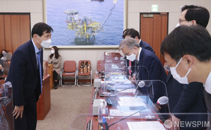 [서울=뉴스핌] 이형석 기자 = 이학영 위원장(왼쪽)이 11일 오전 서울 여의도 국회에서 열린 산업통상자원중소벤처기업위원회 전체회의를 앞두고 권칠승 중소벤처기업부 장관을 비롯한 부처 관계자와 인사를 하고 있다. 2021.11.11 leehs@newspim.com