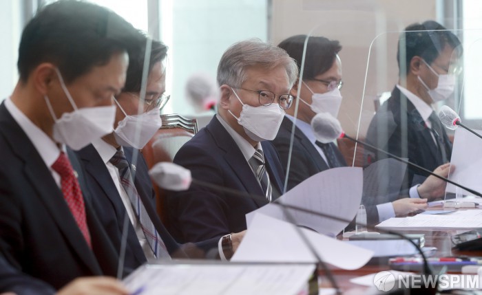 [서울=뉴스핌] 이형석 기자 = 권칠승 중소벤처기업부 장관(왼쪽 세번째)이 11일 오전 서울 여의도 국회에서 열린 산업통상자원중소벤처기업위원회 전체회의에 자리하고 있다. 2021.11.11 leehs@newspim.com