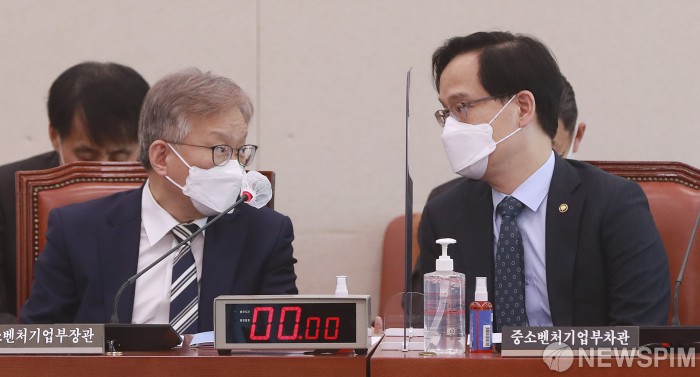 [서울=뉴스핌] 이형석 기자 = 권칠승 중소벤처기업부 장관(왼쪽)과 강성천 차관이 11일 오전 서울 여의도 국회에서 열린 산업통상자원중소벤처기업위원회 전체회의에서 대화를 나누고 있다. 2021.11.11 leehs@newspim.com
