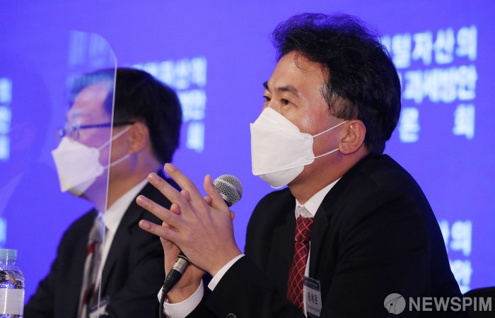 [서울=뉴스핌] 정일구 기자 = 황세운 자본시장연구원 선임연구위원이 11일 오전 서울 여의도 콘래드 서울에서 김영진 더불어민주당 의원·유경준 국민의힘 의원·뉴스핌·한국블록체인협회 주최로 열린 '디지털자산의 합리적 과세방안 토론회'에서 발언을 하고 있다. 이번 토론회는 전문가들을 통해 가상자산 과세의 문제점과 예상되는 부작용에 대해 논의하고, 합리적인 가상자산 과세 방안을 심층 분석하고자 마련됐다. 2021.11.11 mironj19@newspim.com