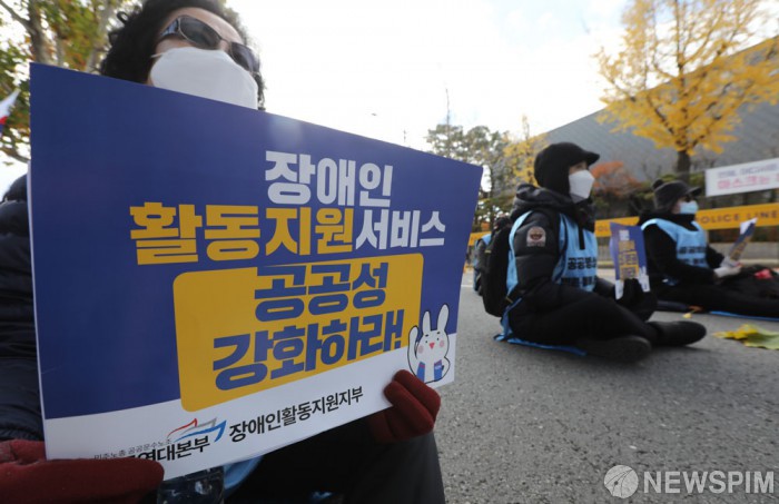[서울=뉴스핌] 황준선 인턴기자 = 11일 오후 서울 종로구 청와대 사랑채 인근에서 민주노총 공공운수노조 의료연대본부 장애인활동지원지부 관계자들이 '장애인활동지원서비스 공공성 강화! 장애인활동지원사 노동기본권 쟁취! 총력투쟁 결의대회'를 열고 있다. 2021.11.11 hwang@newspim.com