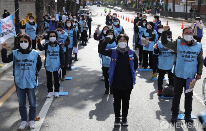[서울=뉴스핌] 황준선 인턴기자 = 11일 오후 서울 종로구 청와대 사랑채 인근에서 민주노총 공공운수노조 의료연대본부 장애인활동지원지부 관계자들이 '장애인활동지원서비스 공공성 강화! 장애인활동지원사 노동기본권 쟁취! 총력투쟁 결의대회'를 열고 구호를 외치고 있다. 2021.11.11 hwang@newspim.com