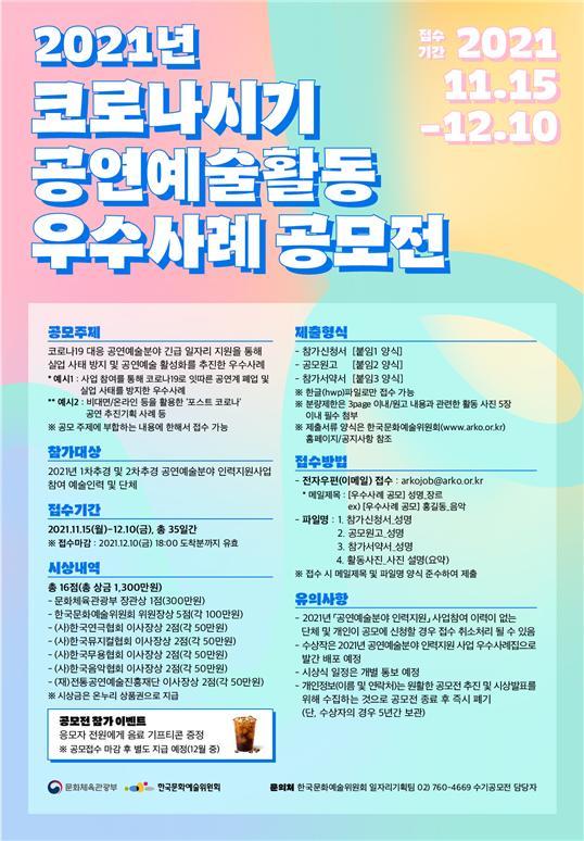 공모대상은 '2021년 공연예술분야 인력지원 사업'에 참여 중인 예술인력 및 단체이며, 공모주제는 코로나19시기 긴급일자리 지원을 통해 실업 사태를 극복하고 공연예술 활성화를 추진한 경험을 담은 수기이다.