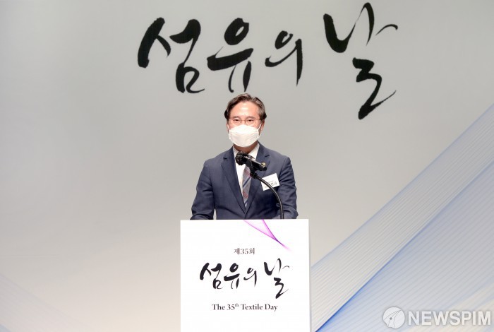 [서울=뉴스핌] 박진규 산업통상자원부 차관이 11일 오후 서울 강남구 섬유센터빌딩에서 열린 제35회 섬유의 날 기념식에서 축사를 하고 있다. [사진=산업통상자원부] 2021.11.11 photo@newspim.com