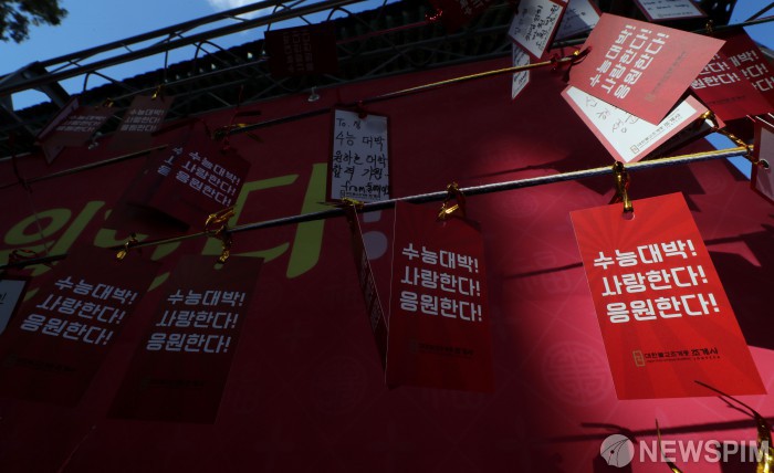 [서울=뉴스핌] 김학선 기자 = 2022학년도 대학수학능력시험(수능)을 6일 앞둔 12일 오후 서울 종로구 조계사에 수능 대박을 응원하는 문구가 붙어 있다. 2021.11.12 yooksa@newspim.com