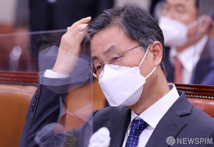 [서울=뉴스핌] 이형석 기자 = 최재해 신임 감사원장이 17일 서울 여의도 국회에서 열린 법제사법위원회 전체회의에 출석해 머리를 쓸어넘기고 있다. 2021.11.17 leehs@newspim.com