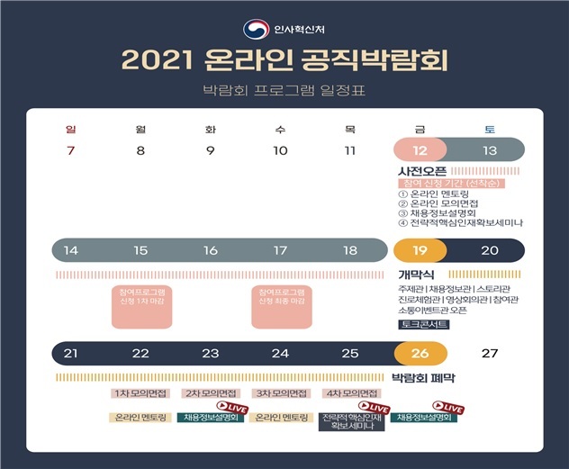 인사처 출범 7주년에 열리는 이번 공직박람회는 개막식을 거쳐 오는 26일까지 8일간 열린다. 중앙행정기관과 지방자치단체, 공공기관 등 70여개 기관이 참여하며, 코로나 상황을 고려해 전면 온라인으로 진행된다.