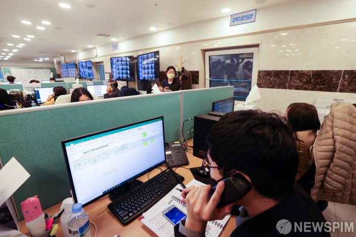 [서울=뉴스핌] 사진공동취재단 = 지난 18일 오후 서울 영등포구의 한 코로나19 생활치료센터 상황실에서 운영총괄반 직원들이 업무를 하고 있다. 2021.11.21 photo@newspim.com