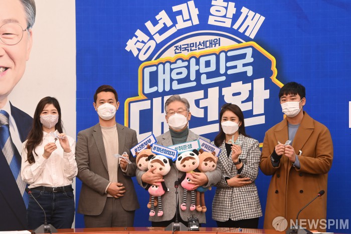 [서울=뉴스핌] 이형석 기자 = 이재명 대선후보가 22일 오전 국회에서 열린 더불어민주당 제1차 전국민 대전환 선거대책위원회의에서 참석자들과 함께 걱정인형을 안고 기념촬영을 하고 있다. 2021.11.22 leehs@newspim.com