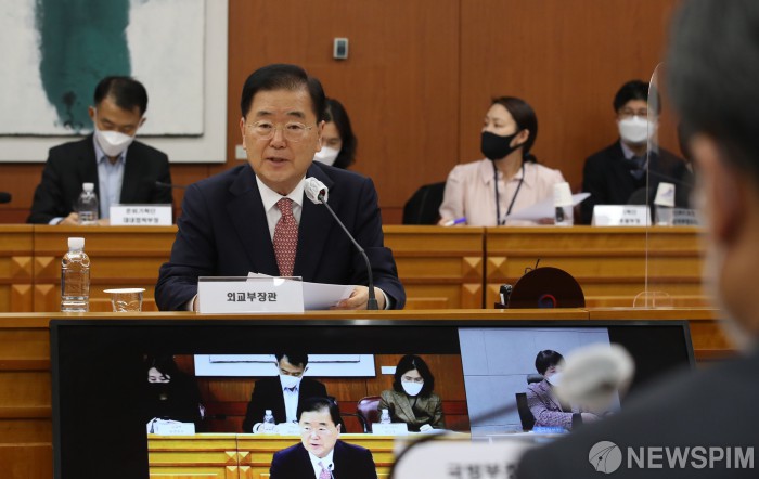 [서울=뉴스핌] 김학선 기자 = 정의용 외교부 장관이 22일 서울 종로구 외교부 청사에서 열린 유엔 평화유지 장관회의 준비위원회 제5차 회의에서 발언하고 있다. 2021.11.22 yooksa@newspim.com