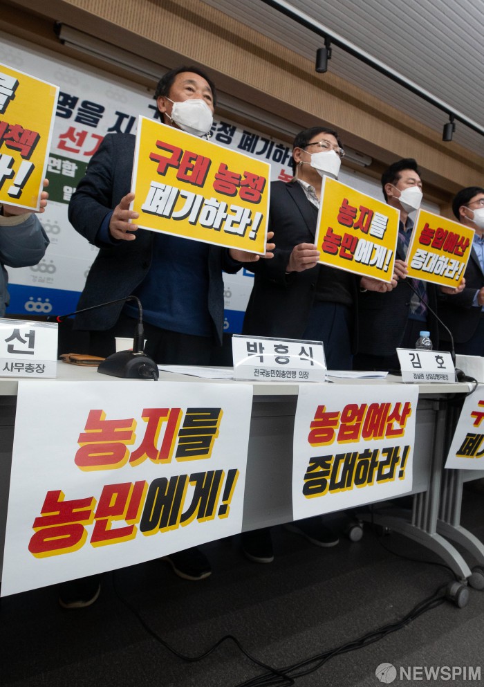 [서울=뉴스핌] 윤창빈 기자 = 경제정의실천시민연합 등 시민단체가 23일 오전 서울 종로구 경실련 강당에서 열린 ‘20대 대통령 선거 농정개혁 공약 제안 기자회견’에서 피켓을 들고 있다. 2021.11.23 pangbin@newspim.com