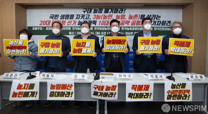 [서울=뉴스핌] 윤창빈 기자 = 경제정의실천시민연합 등 시민단체가 23일 오전 서울 종로구 경실련 강당에서 열린 ‘20대 대통령 선거 농정개혁 공약 제안 기자회견’에서 피켓을 들고 있다. 2021.11.23 pangbin@newspim.com