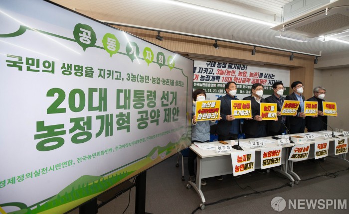 [서울=뉴스핌] 윤창빈 기자 = 경제정의실천시민연합 등 시민단체가 23일 오전 서울 종로구 경실련 강당에서 열린 ‘20대 대통령 선거 농정개혁 공약 제안 기자회견’에서 피켓을 들고 있다. 2021.11.23 pangbin@newspim.com