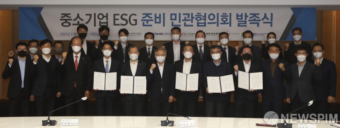 [서울=뉴스핌] 황준선 인턴기자 = 권칠승 중소벤처기업부 장관을 비롯한 내빈들이 23일 오후 서울 중구 대한상공회의소에서 열린 중소기업 ESG 준비 민관협의회 발족식에 참석해 기념사진을 촬영하고 있다. 2021.11.23 hwang@newspim.com