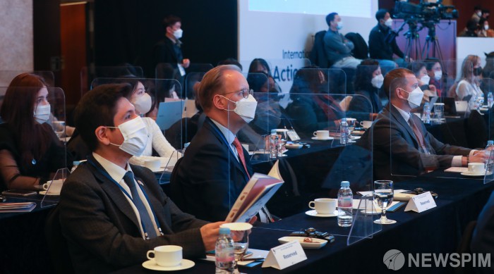 [서울=뉴스핌] 김민지 인턴기자 = 25일 오전 서울 중구 롯데호텔서울에서 열린 제3차 여성과 함께하는 평화 국제회의에서 참석자들이 정의용 외교부 장관의 영상 환영사를 보고 있다. 2021.11.25 kimkim@newspim.com