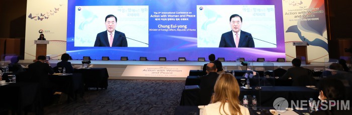 [서울=뉴스핌] 김민지 인턴기자 = 25일 오전 서울 중구 롯데호텔서울에서 열린 제3차 여성과 함께하는 평화 국제회의에서 정의용 외교부 장관이 영상을 통해 환영사를 하고 있다. 2021.11.25 kimkim@newspim.com