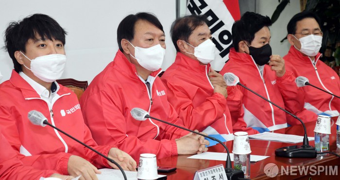 [서울=뉴스핌] 이형석 기자 = 윤석열 대선후보가 20대 대통령선거 D-100일인 29일 국회에서 열린 국민의힘 대선 중앙선거대책위원 회의에서 발언을 하고 있다. 2021.11.29 leehs@newspim.com