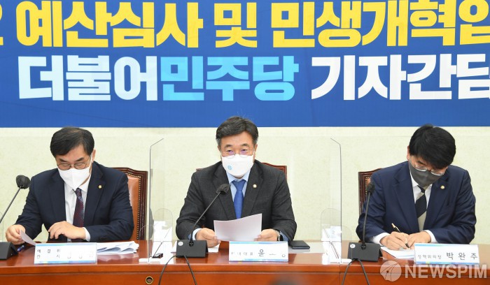 [서울=뉴스핌] 이형석 기자 = 윤호중 더불어민주당 원내대표가 29일 국회에서 2022년 예산심사와 관련해 기자간담회를 하고 있다. 2021.11.29 leehs@newspim.com