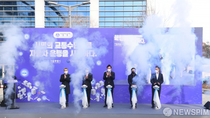 [서울=뉴스핌] 윤창빈 기자 = 자율주행 유상운송 선포식이 열린 29일 서울 마포구 상암동 에스플렉스 앞에서 오세훈 서울시장이 참석자들과 자율차 승객운송서비스 선포 세레머니를 하고 있다. 2021.11.29 pangbin@newspim.com
