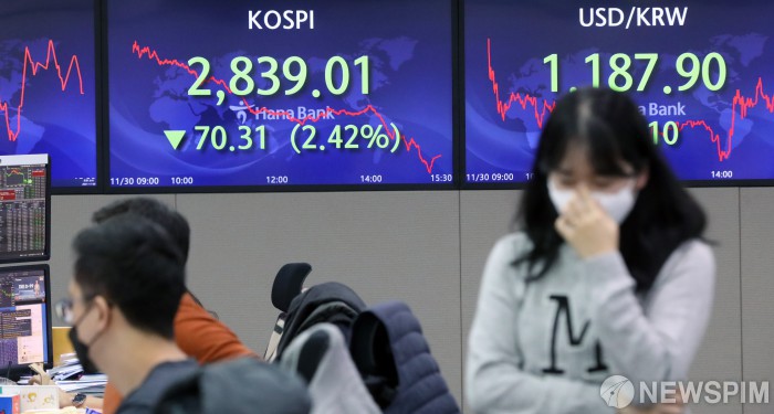 [서울=뉴스핌] 김민지 인턴기자 = 30일 코스피는 전 거래일(2909.32)보다 70.31포인트(2.42%) 내린 2839.01에 장을 마쳤다. 사진은 이날 오후 하나은행 딜링룸 모습. 2021.11.30 kimkim@newspim.com