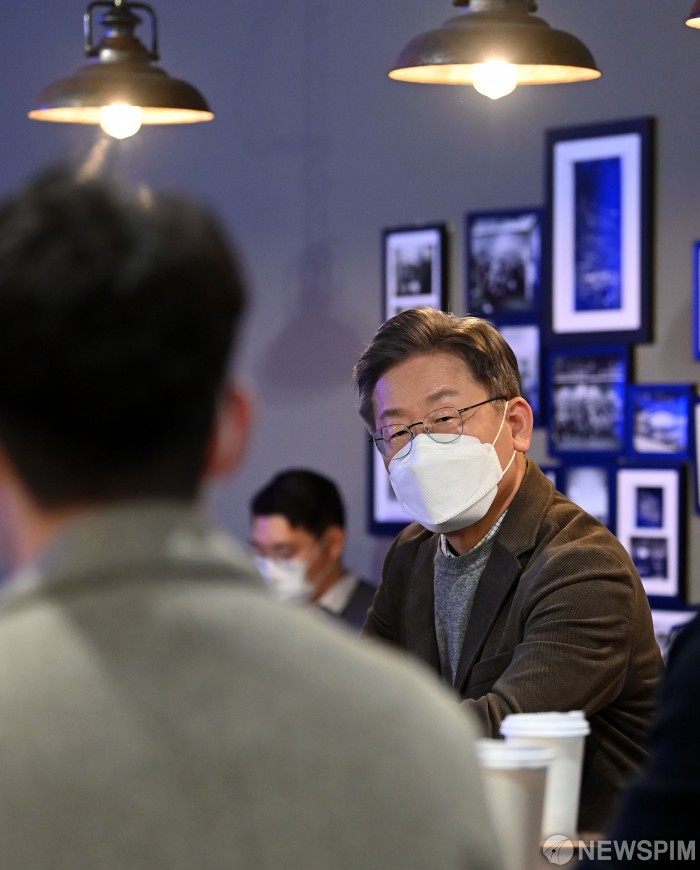 [서울=뉴스핌] 국회사진취재단 = 이재명 더불어민주당 대선 후보가 30일 오후 서울 중구 서울스퀘어에 위치한 기업형 메이커 스페이스 'N15'를 방문해 참석자의 발언을 듣고 있다. 2021.11.30 photo@newspim.com