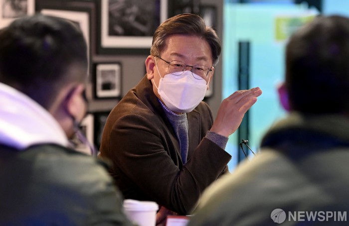 [서울=뉴스핌] 국회사진취재단 = 이재명 더불어민주당 대선 후보가 30일 오후 서울 중구 서울스퀘어에 위치한 기업형 메이커 스페이스 'N15'를 방문해 발언을 하고 있다. 2021.11.30 photo@newspim.com