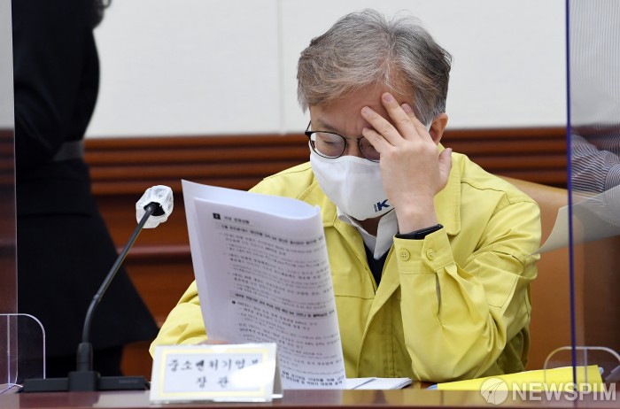 [서울=뉴스핌] 이형석 기자 = 권칠승 중소벤처기업부 장관이 2일 오전 서울 종로구 정부서울청사에서 비상경제 중앙대책본부회의에 참석해 회의 자료를 살펴보고 있다. 2021.12.02 leehs@newspim.com