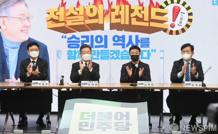 [서울=뉴스핌] 이형석 기자 = 이재명 더불어민주당 대선 후보(왼쪽 두번째)와 송영길 대표(오른쪽)가 2일 오전 서울 영등포구 더불어민주당 당사에서 김영희 PD를 홍보소통본부장으로 영입하며 박수로 환영하고 있다. 2021.12.02 leehs@newspim.com