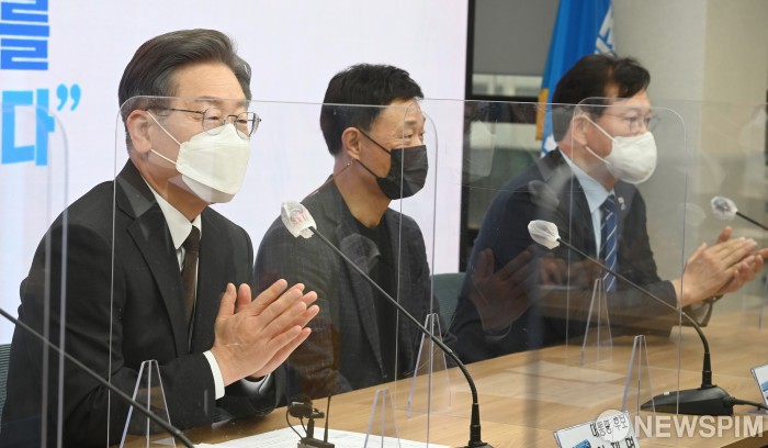 [서울=뉴스핌] 이형석 기자 = 이재명 더불어민주당 대선 후보(왼쪽)가 2일 오전 서울 영등포구 더불어민주당 당사에서 김영희 PD를 홍보소통본부장으로 영입하며 박수로 환영하고 있다. 2021.12.02 leehs@newspim.com