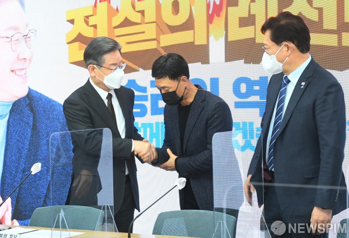 [서울=뉴스핌] 이형석 기자 = 이재명 더불어민주당 대선 후보(왼쪽)와 송영길 대표(오른쪽)가 2일 오전 서울 영등포구 더불어민주당 당사에서 김영희 PD를 홍보소통본부장으로 영입하며 악수를 나누고 있다. 2021.12.02 leehs@newspim.com
