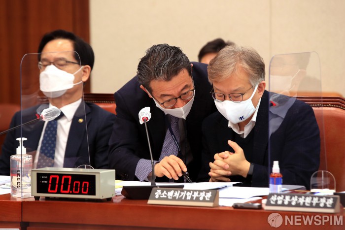 [서울=뉴스핌] 최상수 기자 = 권칠승 중소벤처기업부 장관이 2일 오전 서울 여의도 국회에서 열린 산업통상자원중소벤처기업위원회 전체회의에서 관계자와 대화를 나누고 있다. 2021.12.02 kilroy023@newspim.com