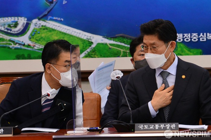 [서울=뉴스핌] 이형석 기자 = 노형욱 국토교통부 장관(오른쪽)과 윤성원 제1차관이 6일 서울 여의도 국회에서 열린 국토교통위원회에서 대화하고 있다. 2021.12.06 leehs@newspim.com