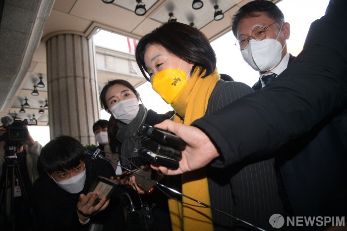 [서울=뉴스핌] 이형석 기자 = 심상정 정의당 대선 후보가 6일 오후 서울 여의도 켄싱턴호텔에서 안철수 국민의당 대선 후보와 회동하기 위해 걸어오고 있다. 2021.12.06 leehs@newspim.com