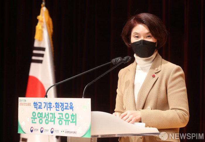 [서울=뉴스핌] 김학선 기자 = 한정애 환경부 장관이 8일 서울 종로구 정부서울청사에서 열린 '학교 기후·환경교육 운영성과 공유회'에서 인사말을 하고 있다. 2021.12.08 yooksa@newspim.com