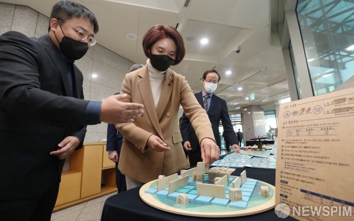 [서울=뉴스핌] 김학선 기자 = 한정애 환경부 장관이 8일 서울 종로구 정부서울청사에서 열린 '학교 기후환경교육 운영성과 공유회'에서 환경교육교구 도움자료들을 살펴보고 있다. 2021.12.08 yooksa@newspim.com