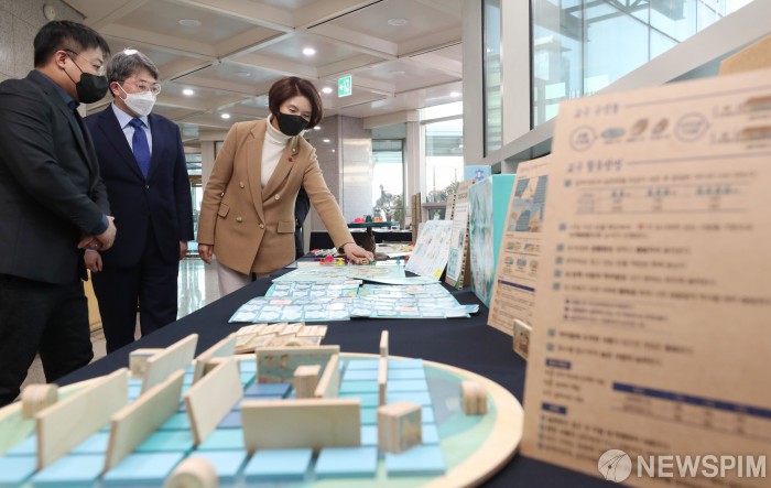 [서울=뉴스핌] 김학선 기자 = 한정애 환경부 장관이 8일 서울 종로구 정부서울청사에서 열린 '학교 기후환경교육 운영성과 공유회'에서 환경교육교구 도움자료들을 살펴보고 있다. 2021.12.08 yooksa@newspim.com