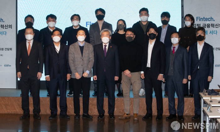 [서울=뉴스핌] 윤창빈 기자 = 고승범 금융위원회 위원장(앞줄 왼쪽 네번째)이 9일 오전 서울 강남구 디캠프에서 열린 핀테크 산업 육성지원 간담회에서 참석자들과 기념촬영을 하고 있다. 2021.12.09 pangbin@newspim.com