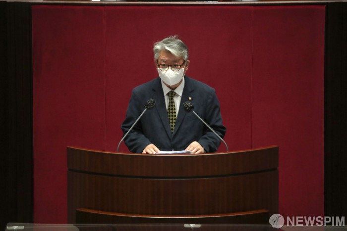 [서울=뉴스핌] 최상수 기자 = 조응천 더불어민주당 의원이 정기국회 마지막 날인 9일 오후 서울 여의도 국회에서 열린 본회의에서 제안설명을 하고 있다. 2021.12.09 kilroy023@newspim.com